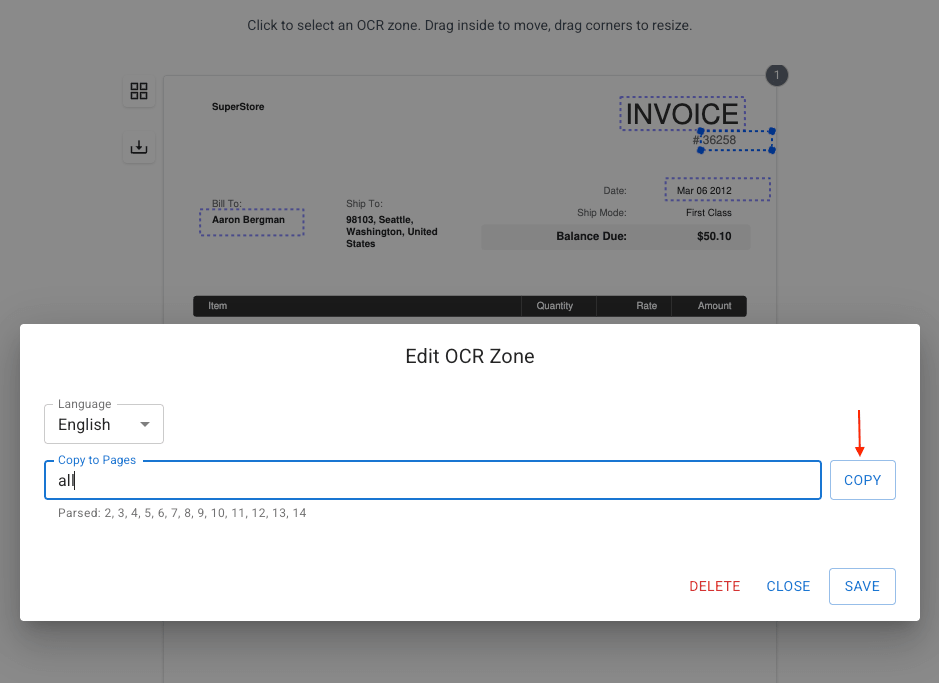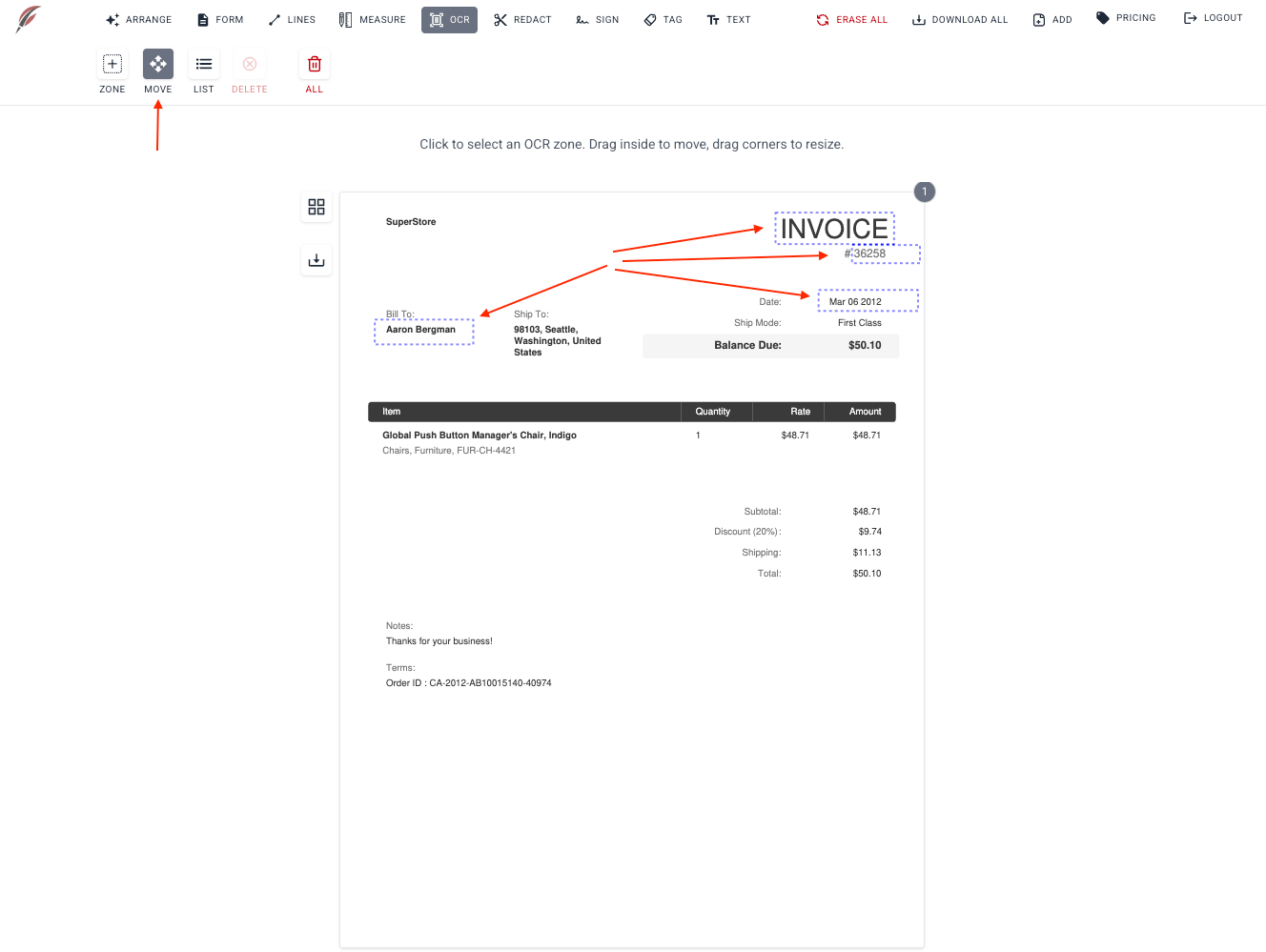 To save time, our tool allows you to copy OCR zones from one page to another. If your document has a consistent layout, you can apply the same zones across multiple pages in a few clicks, ensuring that the right content is captured from every page. Use MOVE tool to adjust and copy zones (double click on a zone to copy it to other pages).