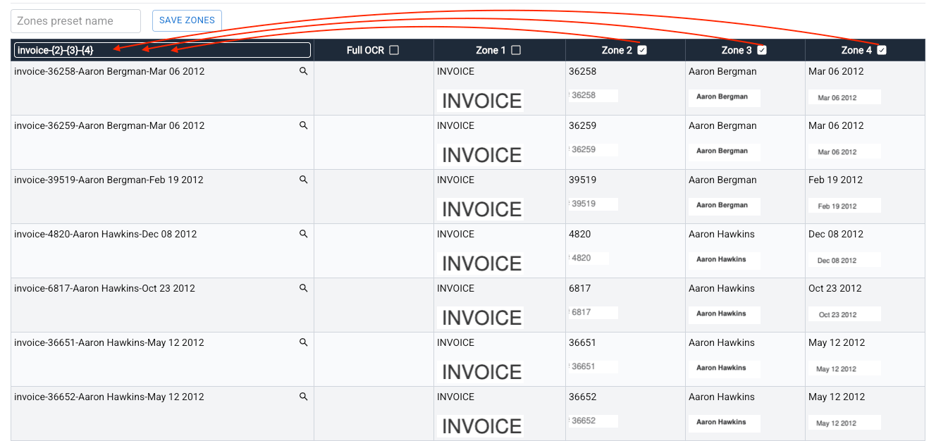 which means: create the “invoices” directory, then client name directory (zone 3) or “unknown” if the document does not contain the name, then date directory (zone 4) and, finally, give each saved PDF name equal to order number (zone 4). If zone 4 text is empty, use page number (N).