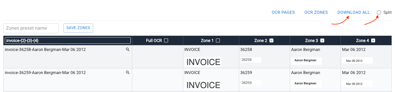 Note: If Split checkbox is not checked, DOWNLOAD ALL will attempt to combine pages from the original files and use OCR content from the first page of each file in the file name pattern. This feature can be helpful for multi-page documents, such as invoices.